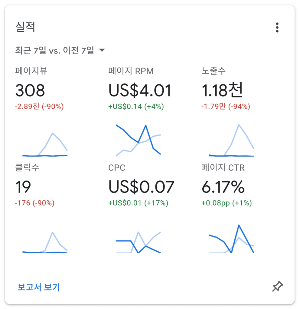 현재 페이지 RPM은 $4.01로 매우 훌륭합니다. 이는 일반적인 블로그 대비 2배 이상의 효율입니다. 클릭률(CTR) 또한 6.17%로, 방문한 독자들은 콘텐츠와 광고에 깊게 반응하고 있습니다. 문제는 90% 급락한 노출수입니다. 댐의 수문은 열려있는데 물이 들어오지 않는 형국입니다.